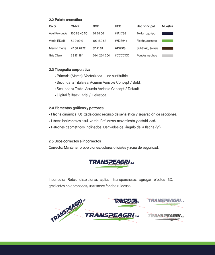 Se desarrolló una identidad sólida y funcional para TRANSPEAGRI S.A., alineada al sector agrícola y al transporte pesado. La marca transmite fuerza, confianza y eficiencia operativa, pensada para flotas, documentación y presencia corporativa.