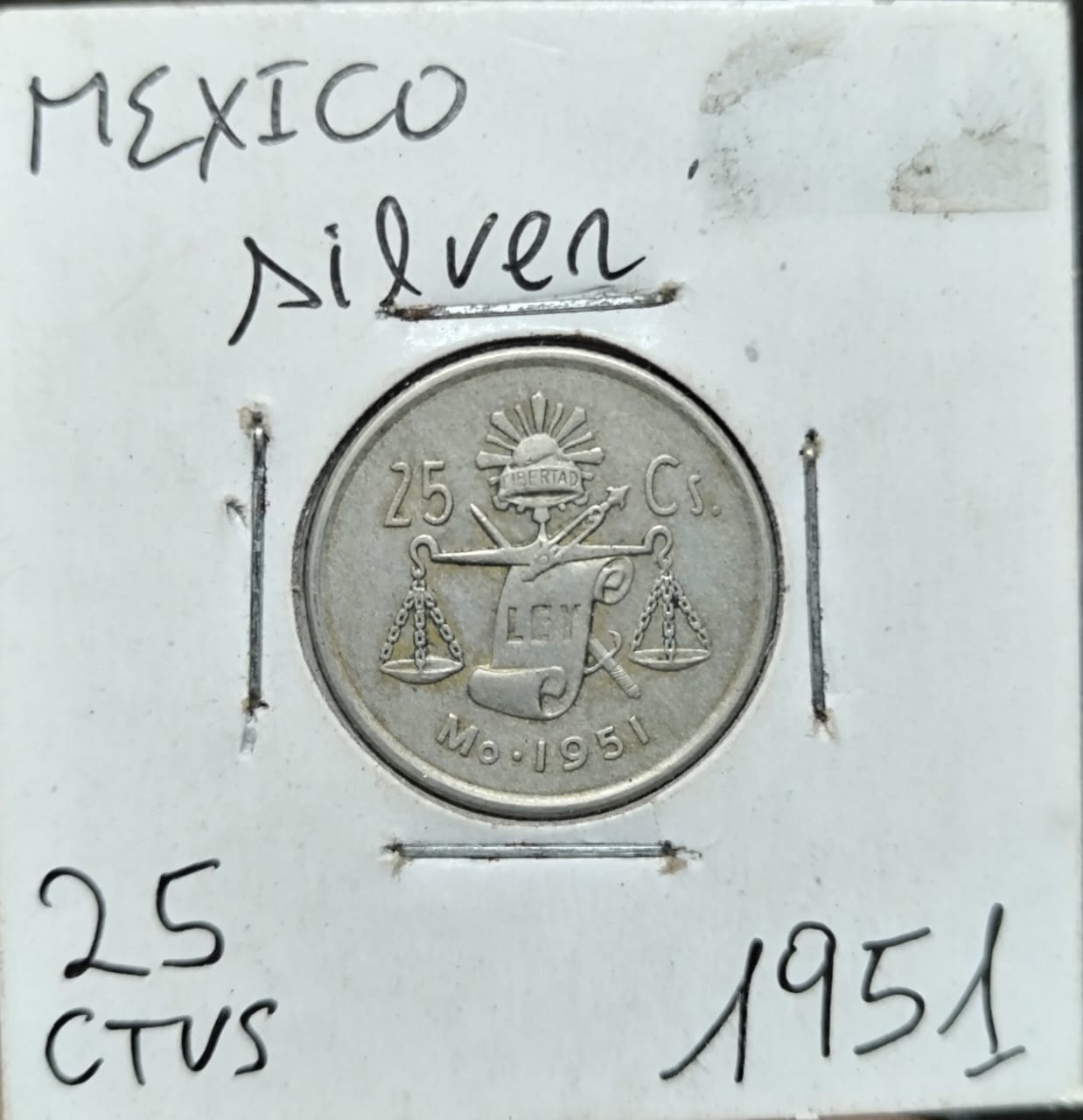 La moneda mexicana de 25 Centavos de 1951 es de plata ley .300, pesa 3.33 gramos, conocida como "la balanza" o "balancita", con el águila mexicana en el anverso y un gorro frigio sobre una balanza y "LEY" en el reverso, acuñada en la Casa de Moneda de México (símbolo "Mo")