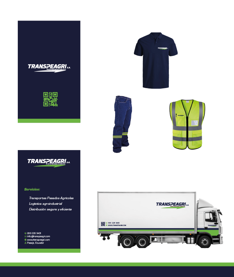 Se desarrolló una identidad sólida y funcional para TRANSPEAGRI S.A., alineada al sector agrícola y al transporte pesado. La marca transmite fuerza, confianza y eficiencia operativa, pensada para flotas, documentación y presencia corporativa.